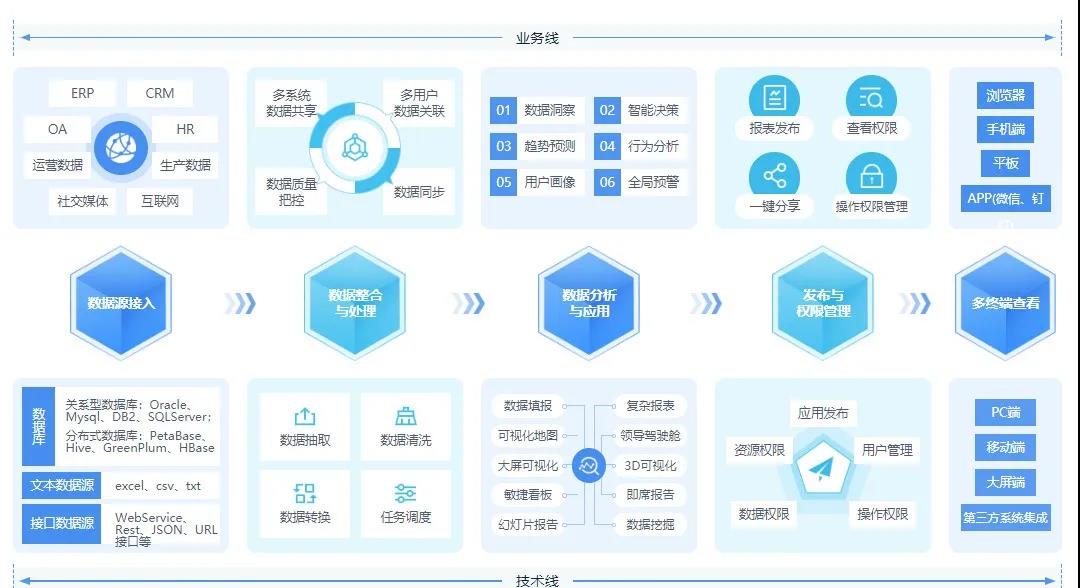 億信華辰深耕大數據領域15年,連續多年榮登商務智能應用榜首,在成千上萬個項目中不斷打磨產品和服務,形成從數據填報、ETL數據處理、數據建模到數據分析、數據可視化、移動應用等一整套企業級商業智能產品方案——