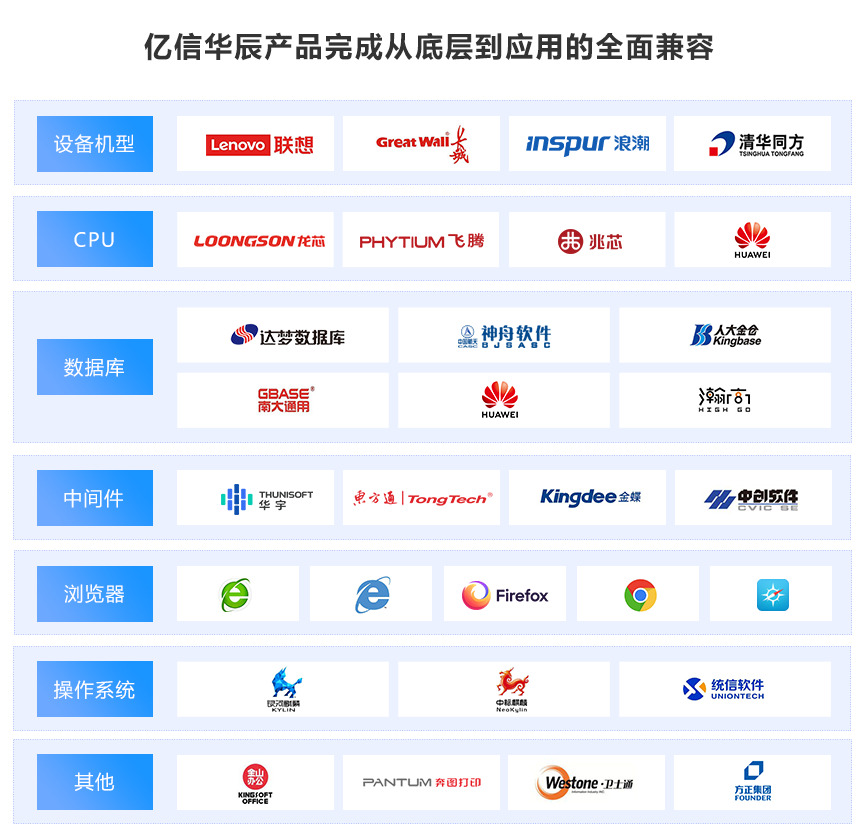 億信華辰旗下產(chǎn)品的開(kāi)發(fā)框架、前后端組件、數(shù)據(jù)組件等,均采用自主研發(fā)完成,整體代碼自研率達(dá)98.3%,掌控核心技術(shù),輕松適配我國(guó)各類軟硬件平臺(tái);并與與飛騰CPU、華為T(mén)aiShan服務(wù)器(鯤鵬平臺(tái))、東方通應(yīng)用服務(wù)器、達(dá)夢(mèng)數(shù)據(jù)庫(kù)以及銀河麒麟、統(tǒng)信操作系統(tǒng)等國(guó)產(chǎn)CPU、操作系統(tǒng)、整機(jī)服務(wù)器廠商的兼容適配工作,共同助推國(guó)產(chǎn)化進(jìn)程。