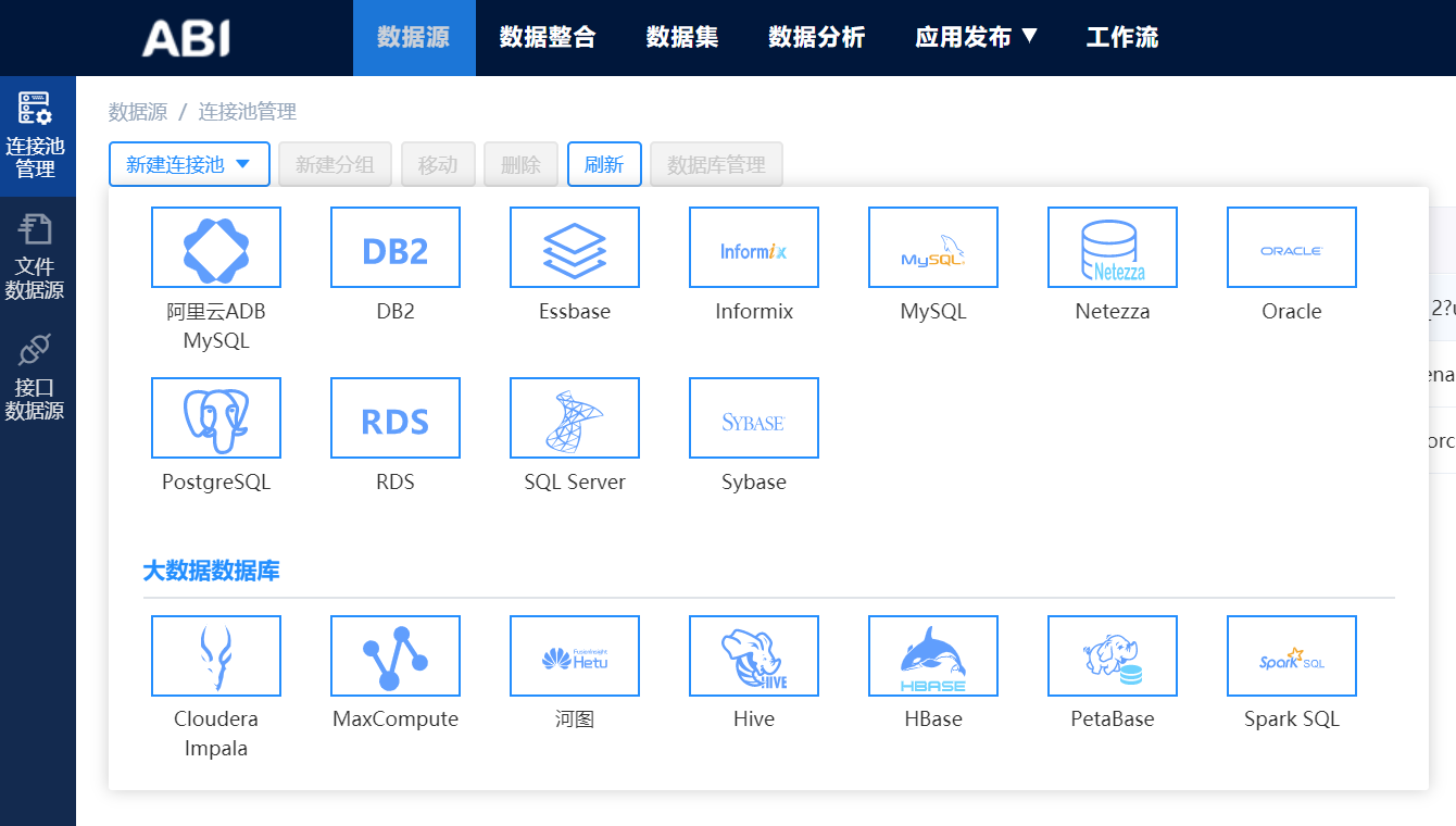 億信ABI支持對接包括:Mysql、Oracle、SQL Server、DB2、GBase、PetaBase、Essbase等多種數(shù)據(jù)庫,而且還支持各種其他類型文件的導入數(shù)據(jù),包括excel、txt、csv、db等等文件。