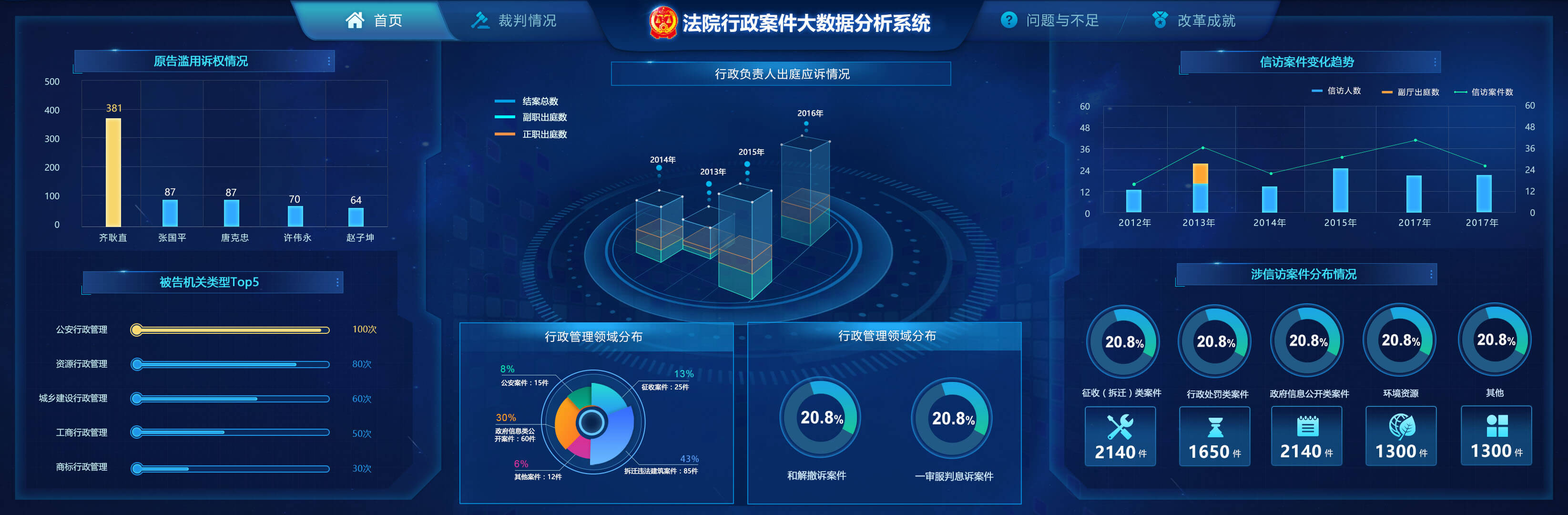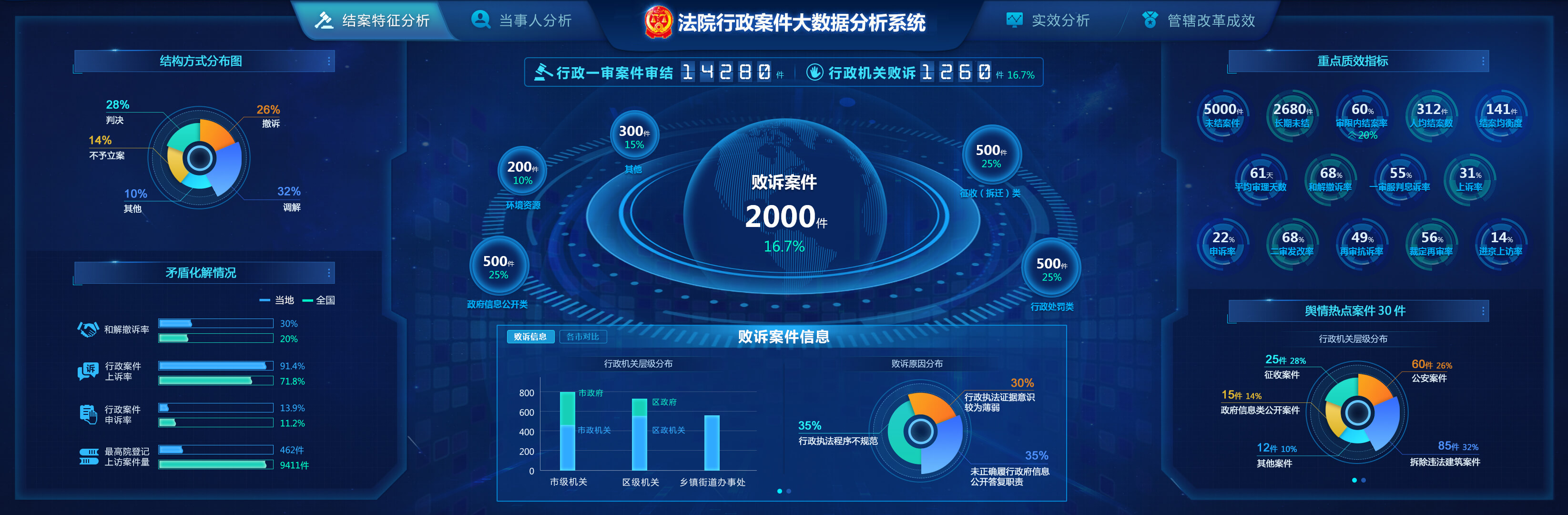 法院行政案件大數(shù)據(jù)分析系統(tǒng)包含了結(jié)案特征分析、當(dāng)事人分析、實(shí)效分析和管轄改革成效。通過(guò)收案/結(jié)案的數(shù)量和增幅,分別用時(shí)間、領(lǐng)域、地區(qū)等維度分析案件變化趨勢(shì),從結(jié)構(gòu)方式、矛盾化解情況、重點(diǎn)質(zhì)效指標(biāo)、輿情熱點(diǎn)案件、敗訴案件和敗訴案件信息來(lái)分析結(jié)案特征,用信訪案件變化趨勢(shì)和分布情況針對(duì)機(jī)關(guān)濫用職權(quán)情況來(lái)特別分析。不同分析角度分析不同數(shù)據(jù),實(shí)現(xiàn)案件大數(shù)據(jù)全方位解讀。