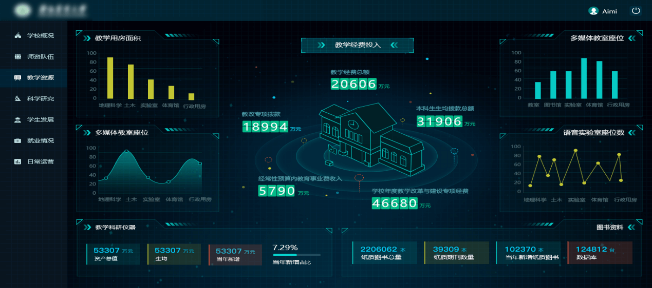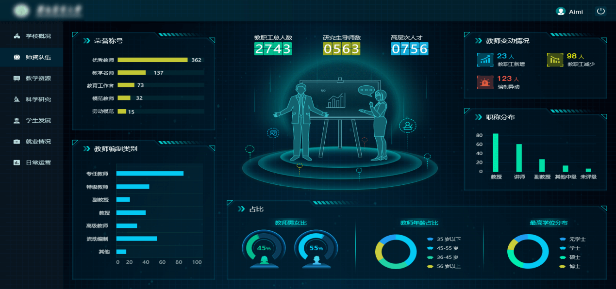 為了展現(xiàn)學(xué)校的實(shí)力,分別從學(xué)校概況、師資隊(duì)伍、教學(xué)資源、科學(xué)研究、學(xué)生發(fā)展、就業(yè)情況和日常運(yùn)營(yíng)的角度來(lái)展示。學(xué)校概況包括辦學(xué)條件、師生情況、學(xué)科專業(yè)和師資力量,再通過(guò)榮譽(yù)稱號(hào)、教師編制類別、教職工人數(shù)、研究生導(dǎo)師數(shù)、高層次人才、職稱分布、最高學(xué)位分布等展示師資隊(duì)伍,用教學(xué)用房面積、教學(xué)經(jīng)費(fèi)投入、教學(xué)科研儀器、圖書資料等來(lái)表現(xiàn)教學(xué)資源,用著作成果、獲獎(jiǎng)成果、論文與專利等展現(xiàn)科學(xué)研究。
