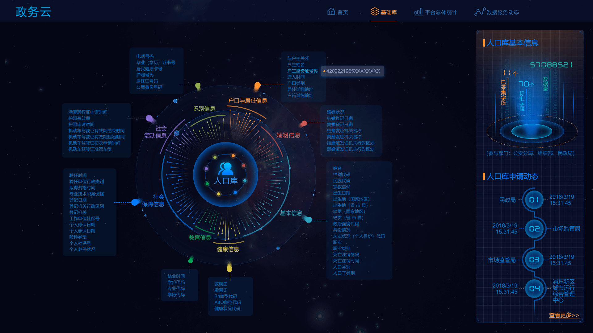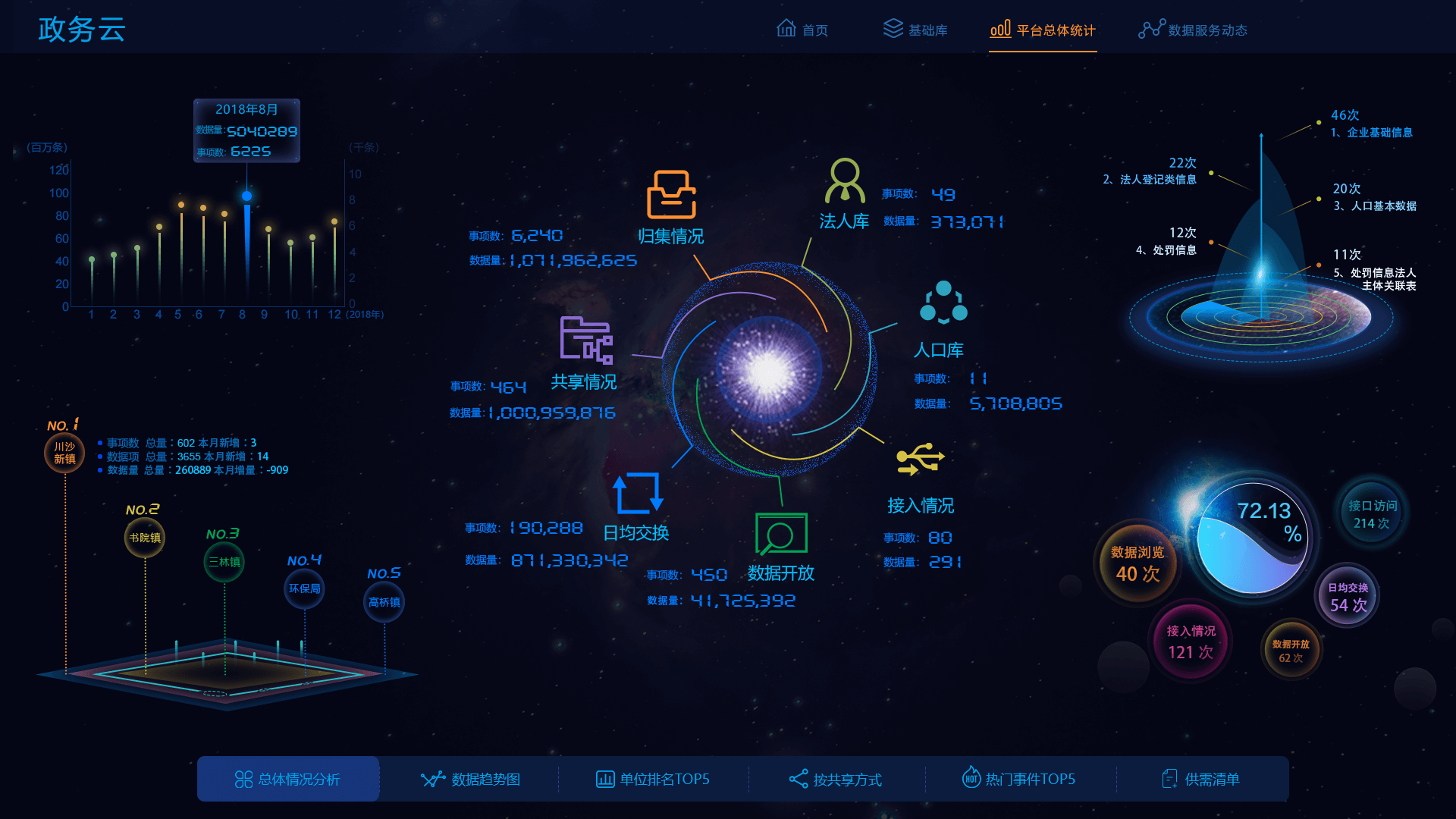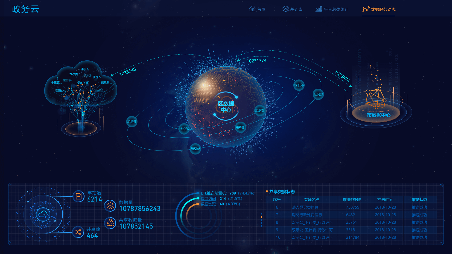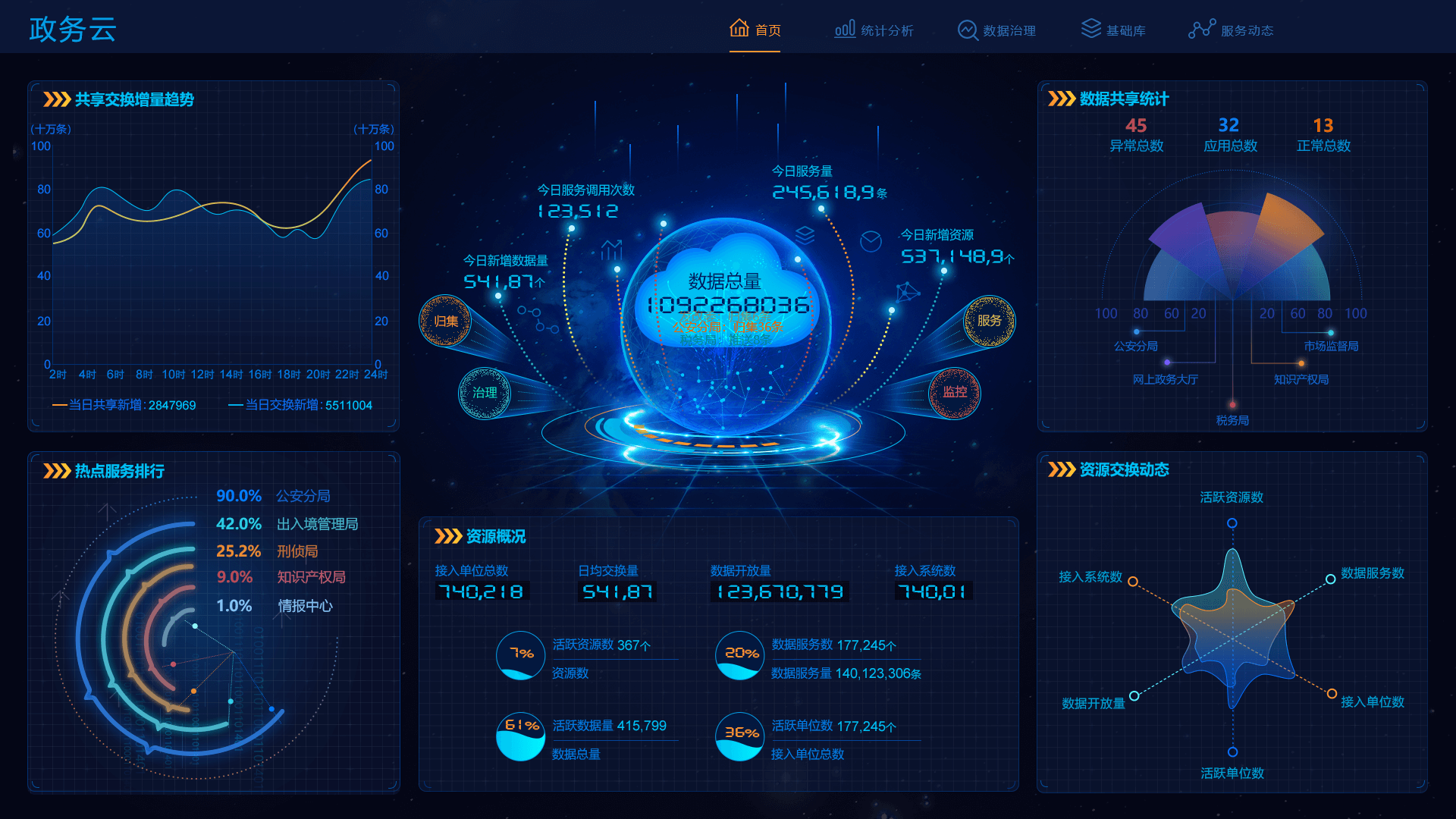 首頁(yè)展示共享方式占比、共享屬性占比、數(shù)據(jù)趨勢(shì)、熱門事項(xiàng)、和單位排名等,基礎(chǔ)庫(kù)包括人口庫(kù)、法人庫(kù),支持搜索刷新,同時(shí)展示庫(kù)的基本信息和申請(qǐng)動(dòng)態(tài),平臺(tái)總體統(tǒng)計(jì)展示平臺(tái)各類指標(biāo)數(shù)據(jù)的訪問(wèn)、更新情況,數(shù)據(jù)服務(wù)動(dòng)態(tài)展現(xiàn)區(qū)數(shù)據(jù)中心和市數(shù)據(jù)中心等的數(shù)據(jù)實(shí)時(shí)交互狀況,實(shí)現(xiàn)數(shù)據(jù)全方位全時(shí)段把控。